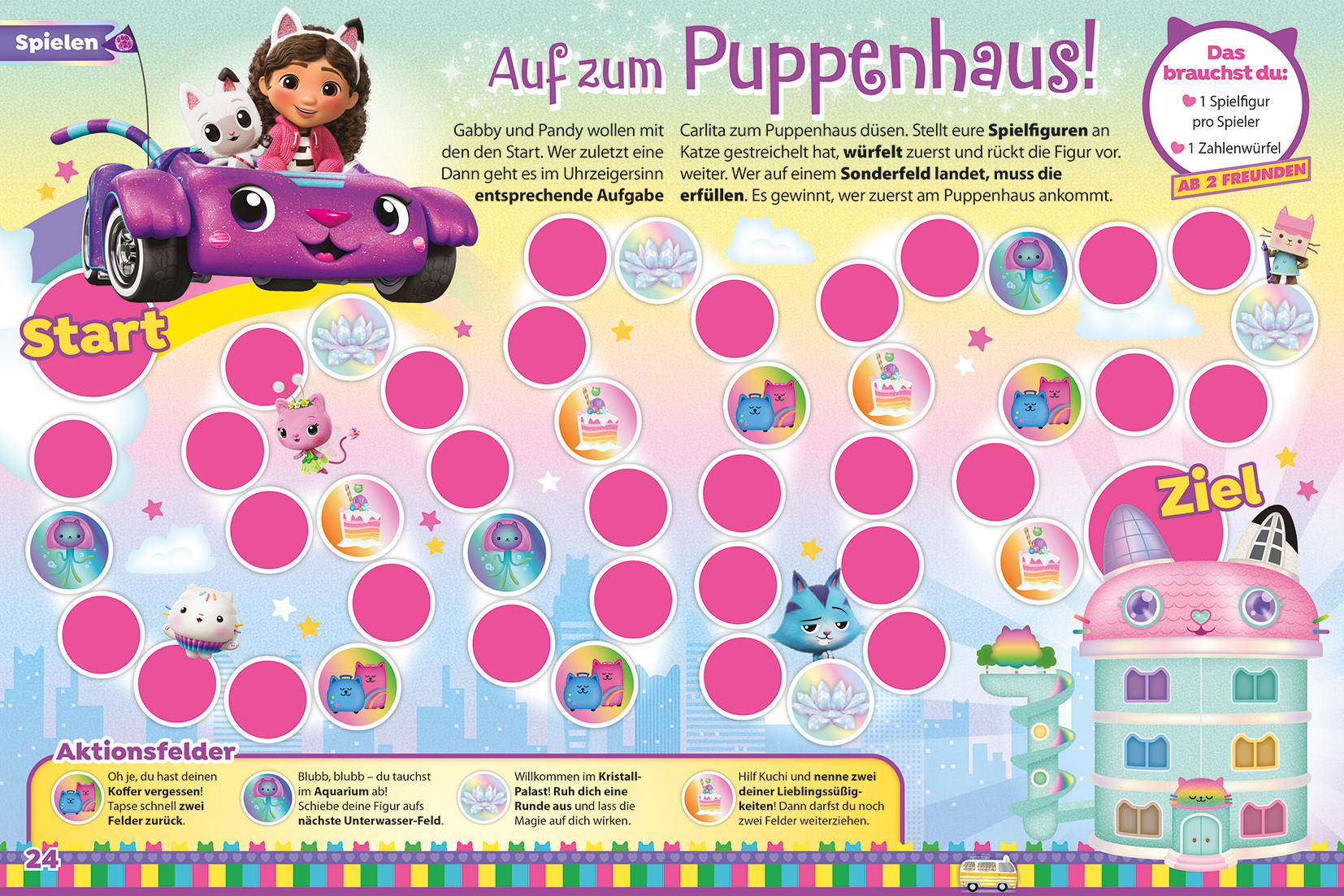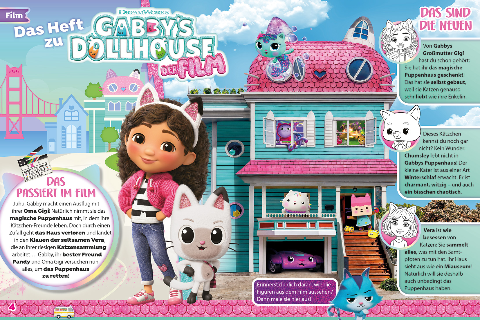 Basierend auf dem neuen Kino-Film „Gabby's Dollhouse“ bietet das neue Magazin alles, was junge Katzen-Fans begeistert: knifflige Rätsel, kreative Bastelideen, viele lustige Spiele und exklusive Einblicke in den Film. Gemeinsam mit den beliebten Figuren aus der zauberhaften Puppenhauswelt tauchen die Kinder spielerisch in ihre eigene Fantasie und Kreativität ein – ein unterhaltsames Erlebnis für die ganze Familie!