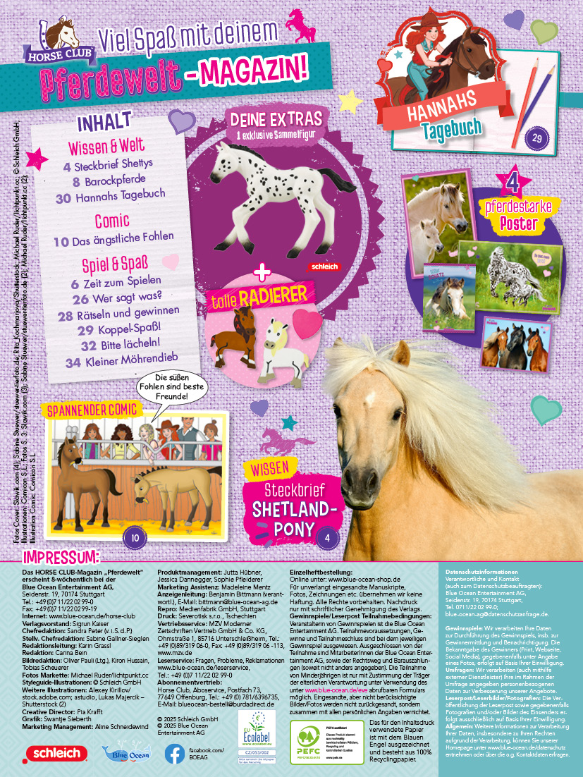 Das neue "HORSE CLUB - Pferdewelt"-Magazin begeistert alle Pferdefreunde auf insgesamt 36 liebevoll gestalteten Seiten mit fesselnden Lesegeschichten, kniffeligen Rätseln und faszinierenden Reportagen rund um die süßen Pferdekinder. Hier erfahren die Leserinnen und Leser alles über die Entwicklung der munteren Fohlen, wie sie heranwachsen und miteinander spielen