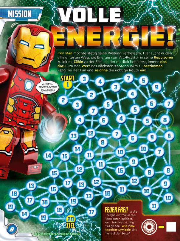 Das neue LEGO® Marvel Avengers Magazin bringt die volle Superhelden-Power direkt zu dir nach Hause. Iron Man, Thor, der Hulk, Captain America und ihre Verbündeten liefern auf 36 Seiten jede Menge Infos, knifflige Rätsel und einen actiongeladenen Comic. Dazu in jeder Ausgabe eine original LEGO® Marvel Avengers Minifigur.