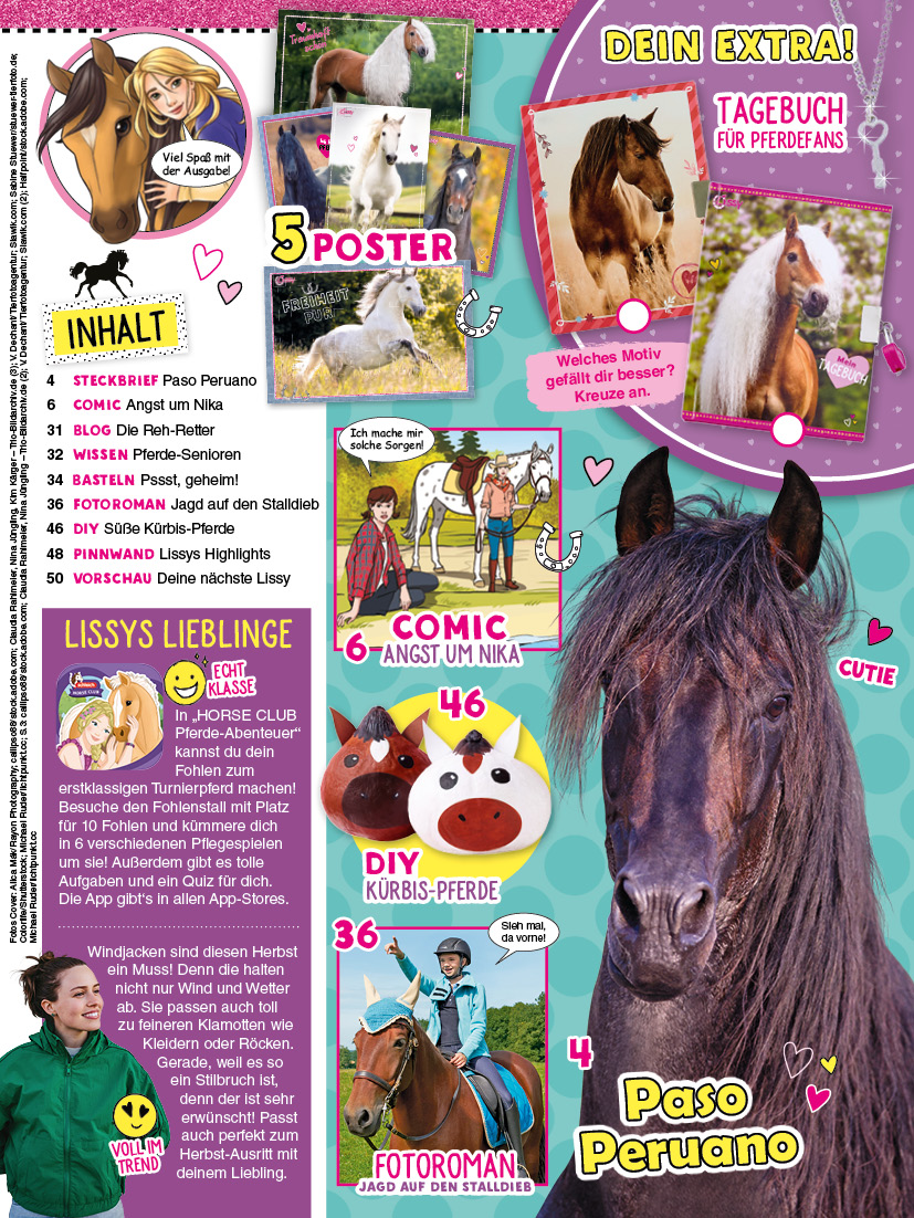 Im Kult-Comic können Leserinnen und Leser die Abenteuer von Lissy und ihren Freunden im Pony-Club hautnah miterleben. Dank 54 aufwendig gestalteten Magazin-Seiten bleibt hier kein Leserwunsch offen. Jeden Monat gibt es tolle Reportagen, spannende Wissensseiten, coole Tests sowie wunderschöne Poster-Seiten rund um den Reitsport und seine faszinierenden Tiere.