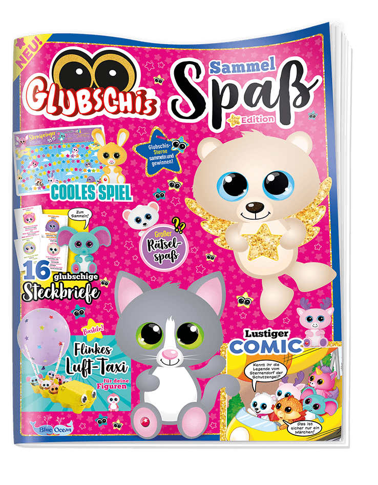 Stars der neuen Serie sind der Chef-Schutzengel Glowy Bombo, der hilft, wenn die Glubschis Probleme oder Sorgen haben, sowie Loulay, deren gute Laune immer ansteckend wirkt. 14 weitere liebevoll und detailliert gestaltete Glubschis gehören zur Star-Edition - die lila Robbe Bubbla, die schlaue Eisbärin Anuka, das rosa Rentier Rosani und viele weitere. In jedem Folienbeutel befinden sich eine der 16 Figuren und ein Merkblatt mit Informationen zu der Figur sowie einer Übersicht zu allen Glubschis der Kollektion. Eine große Übersicht zu allen Figuren und ihren Besonderheiten ist im Heft 10 von Glubschis Sammelspaß zu finden, das heute parallel zu der Sammelserie zum Copypreis von 5,99 Euro erscheint.