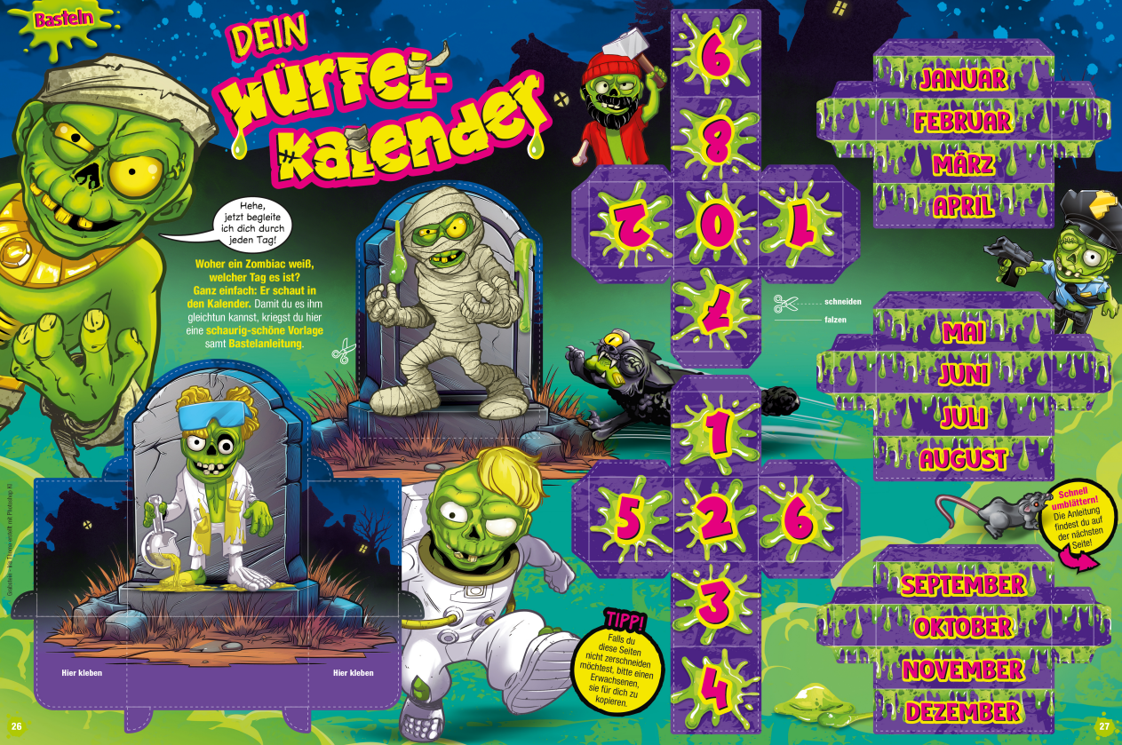Wollt ihr mehr über die verschiedenen Charaktere erfahren und tiefer in die ZOMBIACS-Welt eintauchen? Ergänzend zur Sammelserie erscheint alle zwei Monate eine neue Ausgabe. Die Leser dürfen sich auf ein Mix aus spannenden Comics, kniffligen Rätseln, Spielen zum Aktivwerden, einem Poster und einer Ausmalseite freuen.